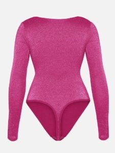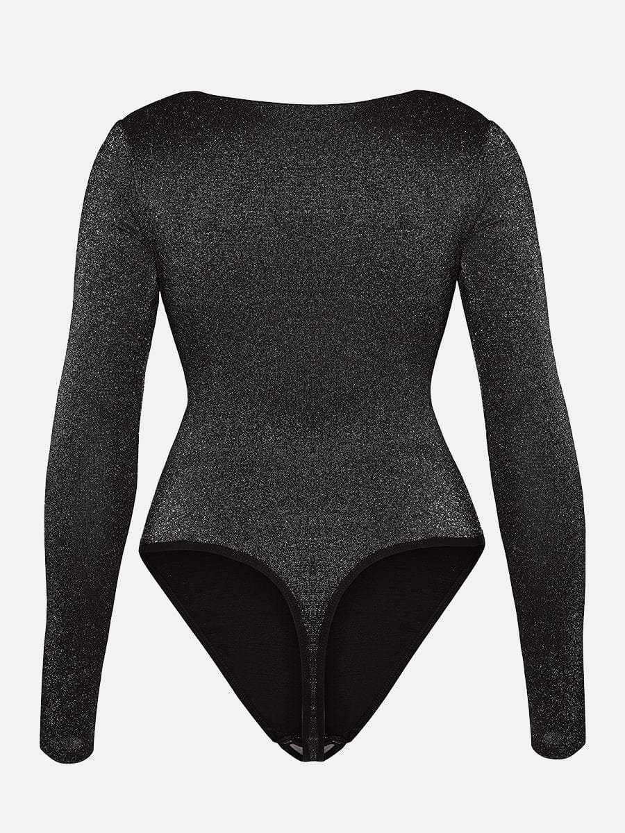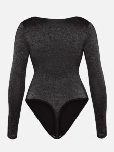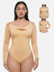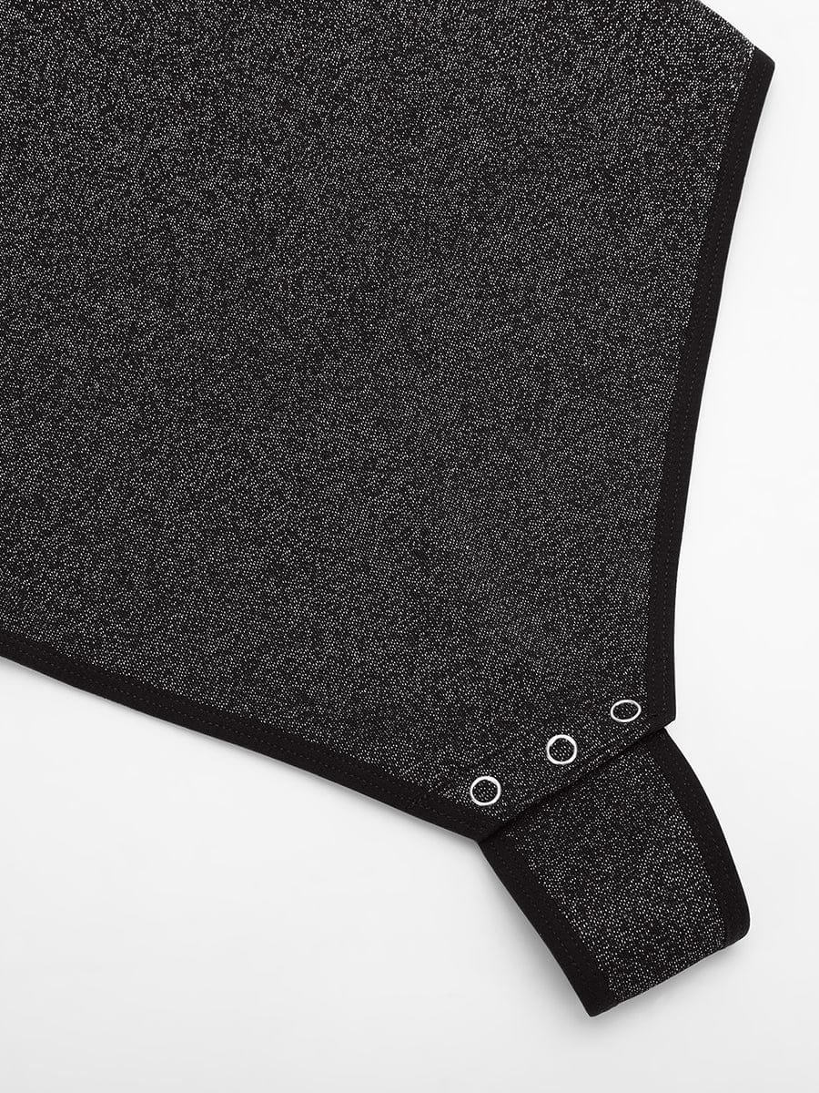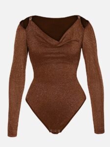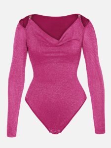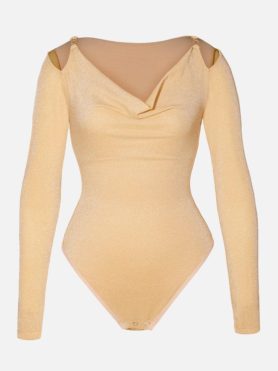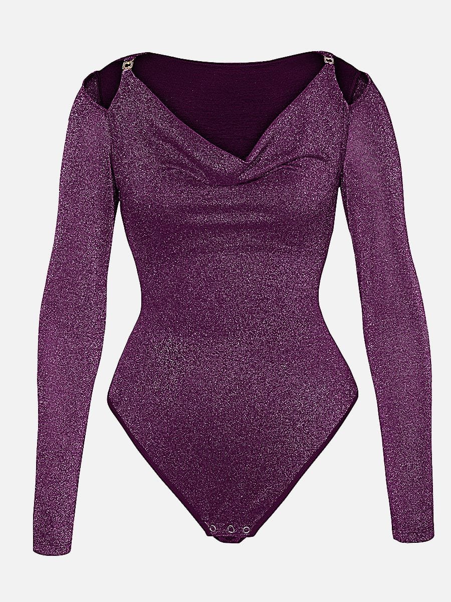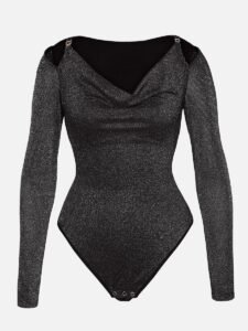Shiny Draped Neck Bodysuit with Built-In Bra