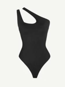 1. Shoulder cutout: The asymmetrical bodysuit features a bodycon silhouette with a shoulder cutout;