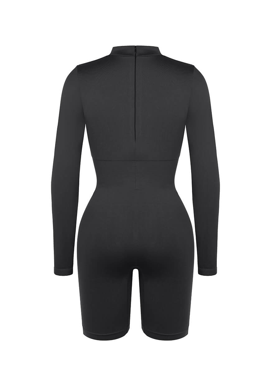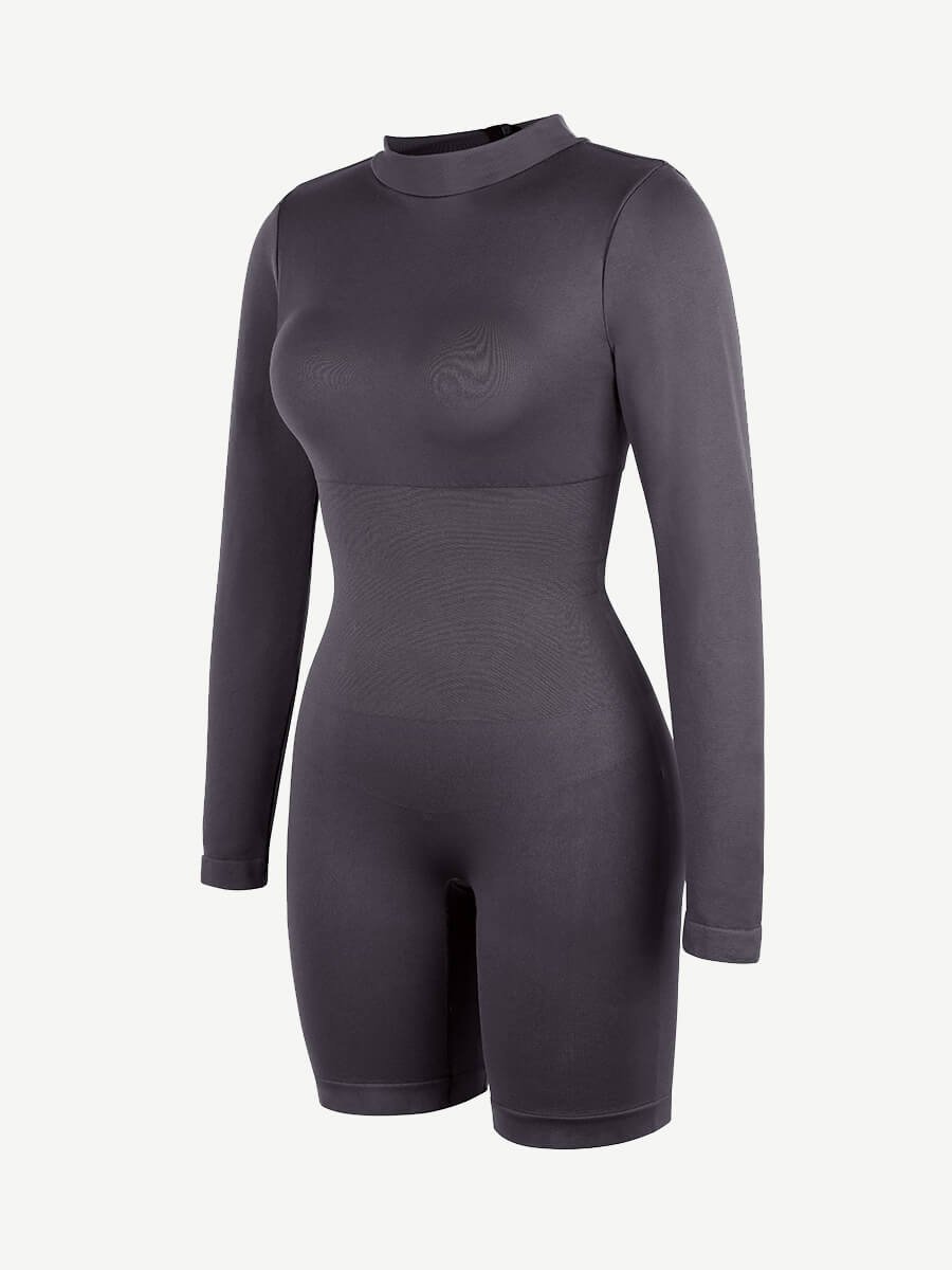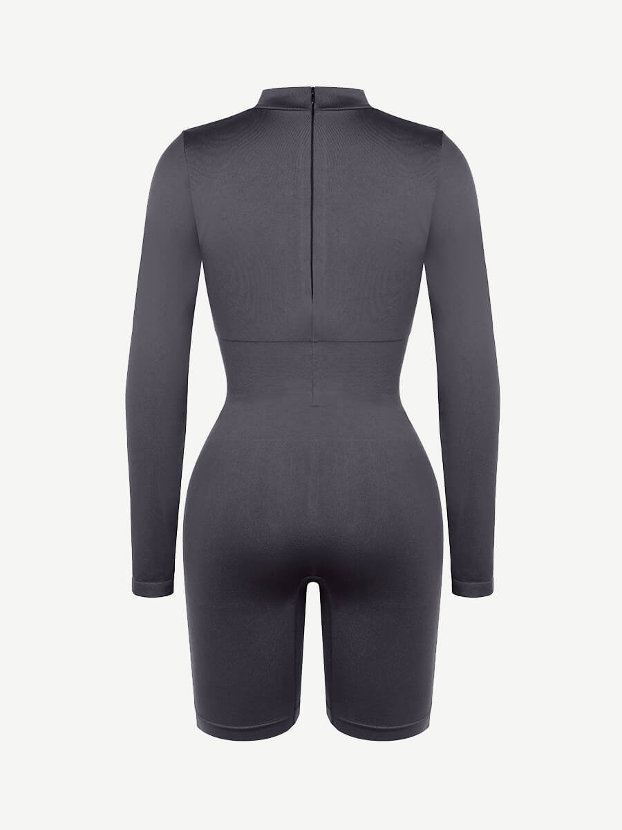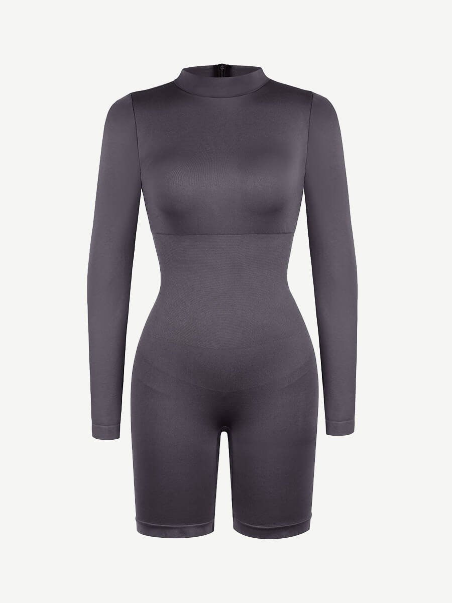 This shapewear features a semi-high collar, double-layered chest with removable pads, tight-knit waist and abdomen, inner chest support, invisible back zipper, and seamless high-elasticity yarn for comfort and shaping.