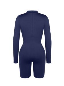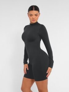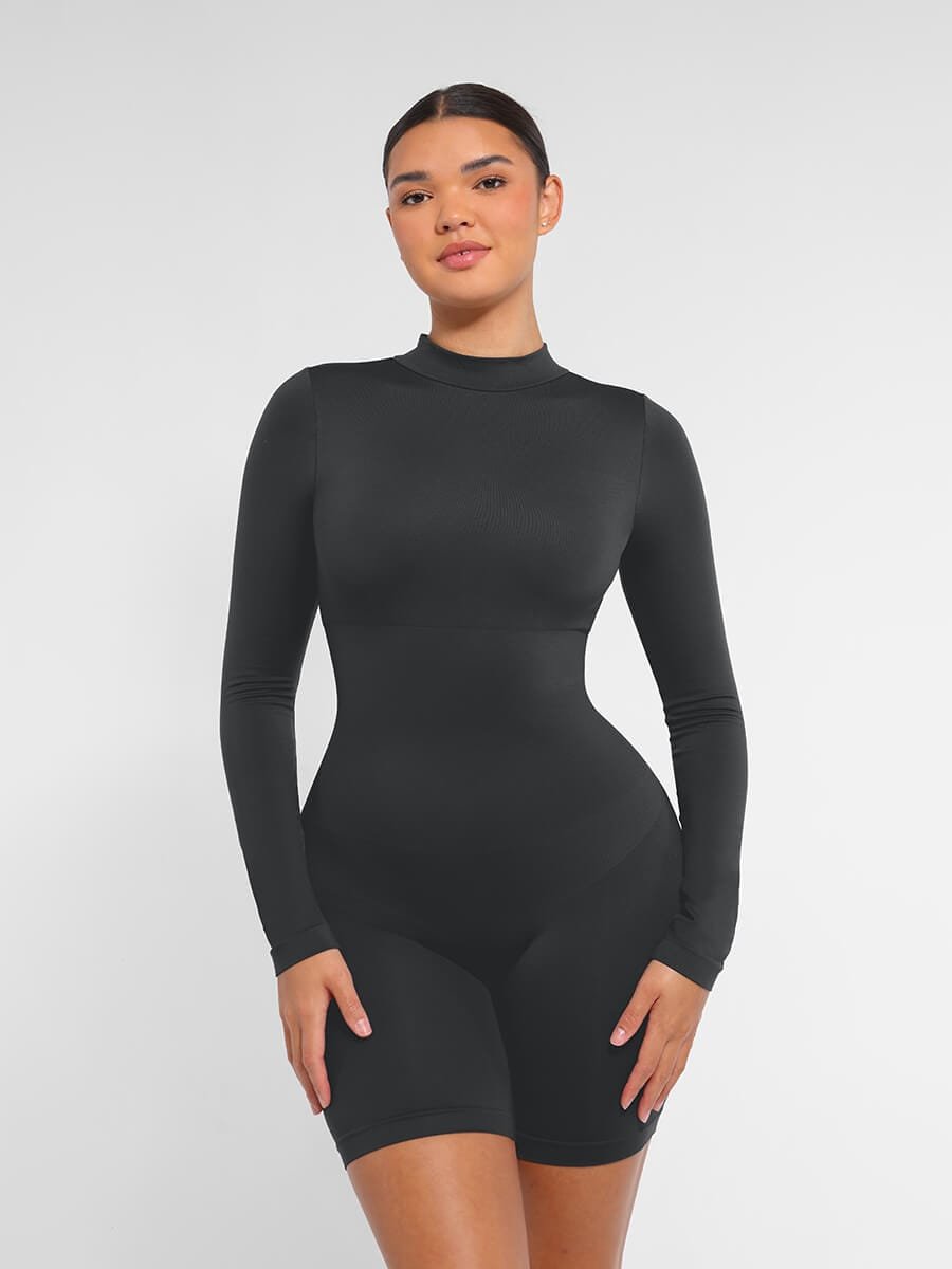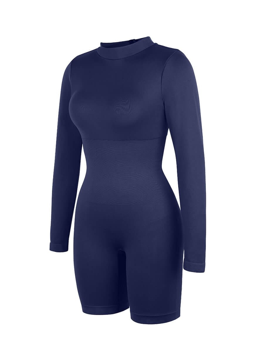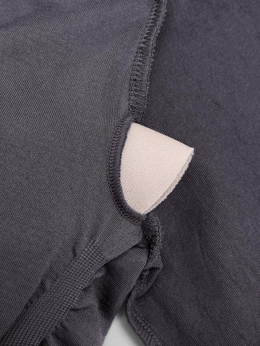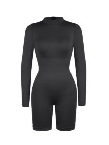 This shapewear features a semi-high collar, double-layered chest with removable pads, tight-knit waist and abdomen, inner chest support, invisible back zipper, and seamless high-elasticity yarn for comfort and shaping.